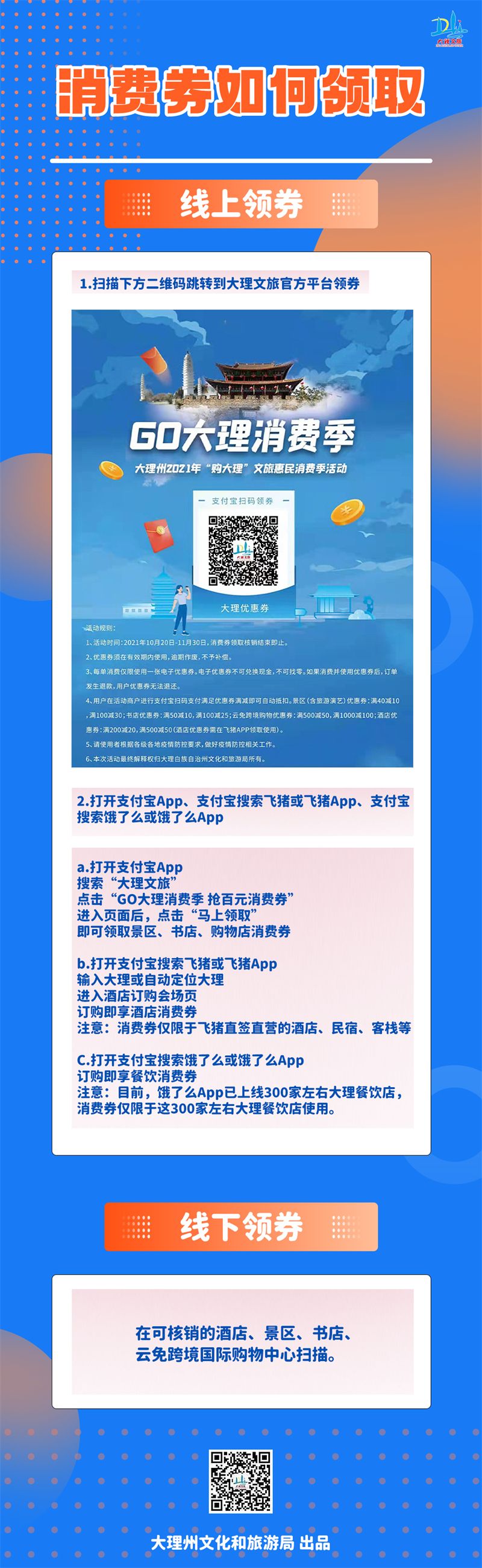 為深入貫徹落實(shí)《國務(wù)院辦公廳關(guān)于進(jìn)一步激發(fā)文化和旅游消費(fèi)潛力的意見》《文化和旅游部 國家發(fā)展改革委 財(cái)政部關(guān)于開展文化和旅游消費(fèi)試點(diǎn)示范工作的通知》要求,大力促進(jìn)文旅消費(fèi)惠民,大理州文化和旅游局與支付寶合作,由支付寶攜手阿里巴巴集團(tuán)旗下飛豬事業(yè)部、餓了么、服務(wù)商快盈科技共同推出本次活動。