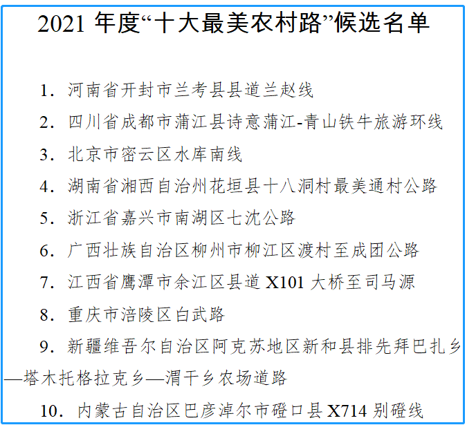 根據(jù)《交通運(yùn)輸部辦公廳關(guān)于開展2021年度“十大最美農(nóng)村路”推選宣傳活動的通知》(交辦政研函〔2021〕734號)有關(guān)安排,產(chǎn)生了2021年度“十大最美農(nóng)村路”等候選路線,現(xiàn)予以公示。