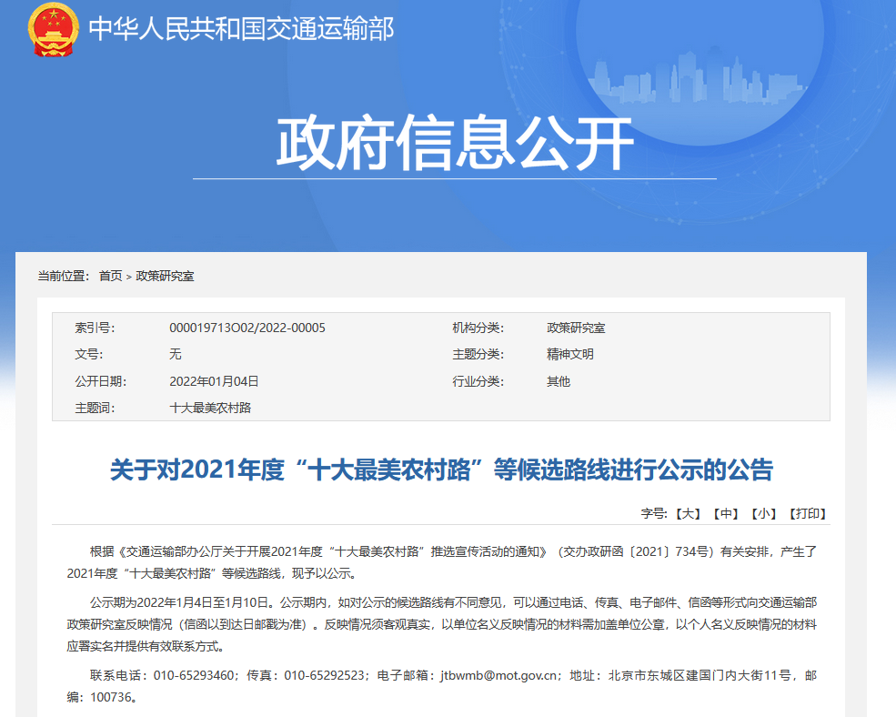 公示期為2022年1月4日至1月10日。公示期內(nèi),如對公示的候選路線有不同意見,可以通過電話、傳真、電子郵件、信函等形式向交通運(yùn)輸部政策研究室反映情況(信函以到達(dá)日郵戳為準(zhǔn))。反映情況須客觀真實,以單位名義反映情況的材料需加蓋單位公章,以個人名義反映情況的材料應(yīng)署實名并提供有效聯(lián)系方式?! ?/p>