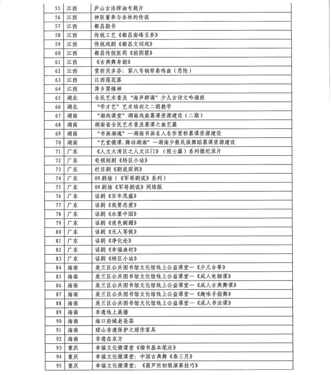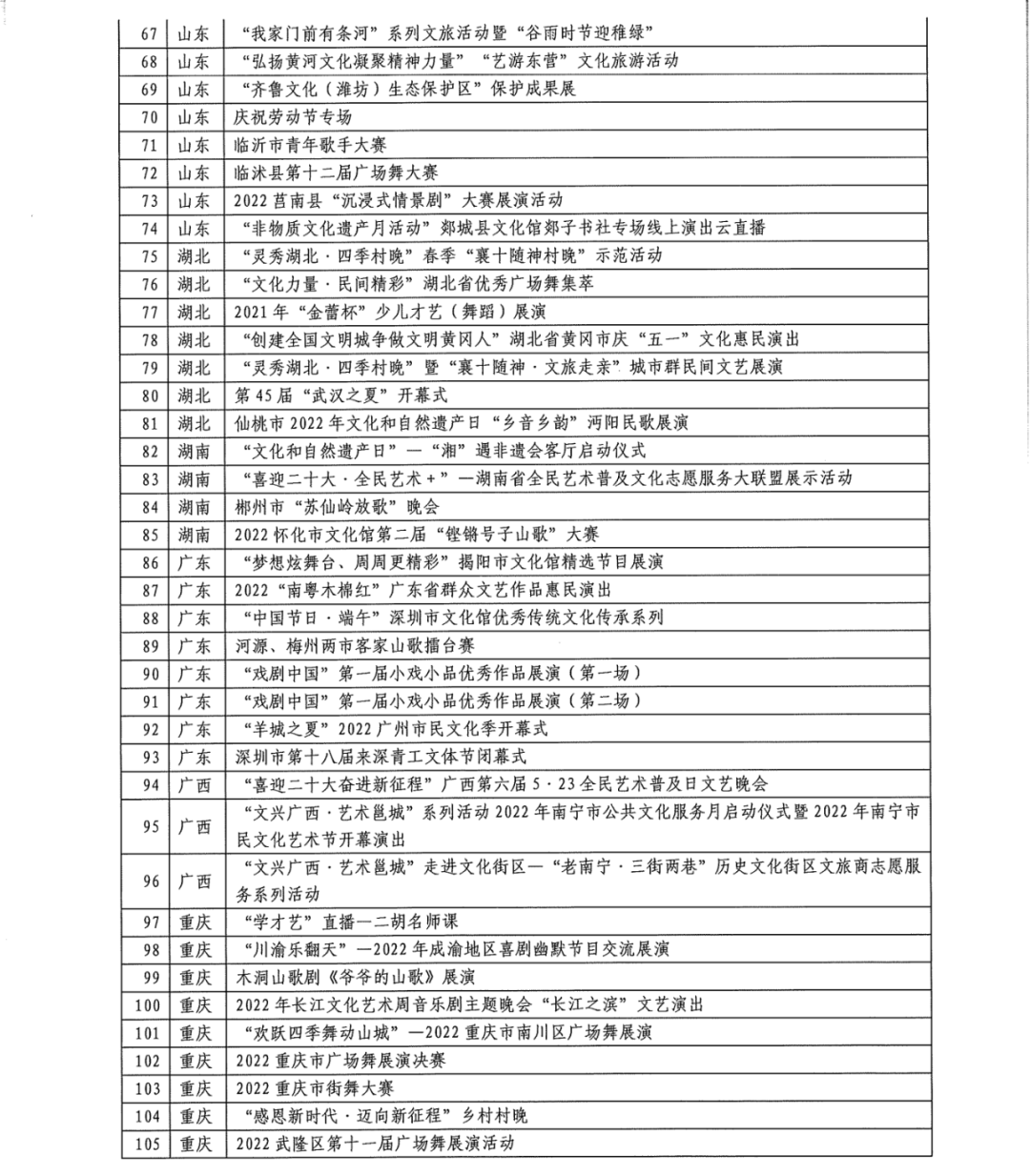為貫徹落實(shí)《“十四五”公共文化服務(wù)體系建設(shè)規(guī)劃》,推動(dòng)國家公共文化云網(wǎng)絡(luò)直錄播高質(zhì)量發(fā)展,深化供給側(cè)結(jié)構(gòu)性改革,提升人民群眾文化獲得感、幸福感,文化和旅游部全國公共文化發(fā)展中心(以下簡稱“發(fā)展中心”)組織開展了2022年第二季度國家公共文化云網(wǎng)絡(luò)直錄播遴選工作,經(jīng)過各地報(bào)送和審核遴選,共有479個(gè)直錄播納入第二季度國家公共文化云播出計(jì)劃,現(xiàn)予公布。