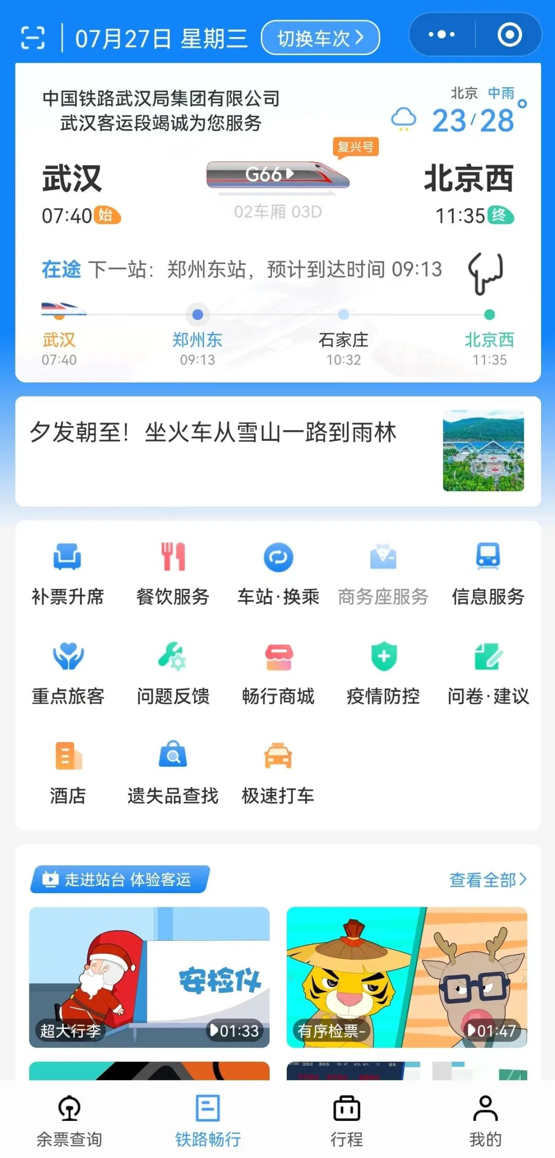 鐵路暢行碼將旅客所乘列車的相關(guān)信息以及12306中最常用的功能集合在一起掃碼即可看到↓↓↓所乘列車的車次、日期車廂號、席位號始發(fā)終到站名、列車時(shí)刻表終到站天氣情況、正晚點(diǎn)信息列車行駛軌跡等