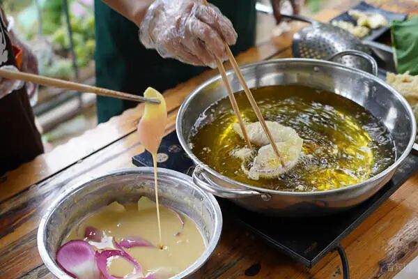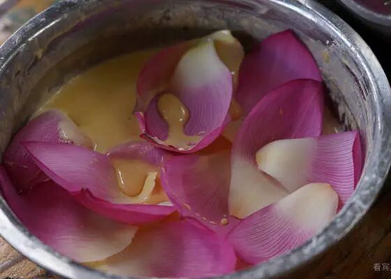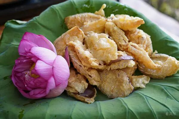 經(jīng)過(guò)一段時(shí)間的蒸制,荷葉豆腐便成型了,從蒸箱取出放涼,切成小塊油鍋過(guò)一遍,一道外酥里嫩的荷葉豆腐便完成了。緊接著,蘇曉三把剛采摘回來(lái)的荷花花瓣,裹上其妻子用雞蛋、面粉、食鹽等食材和調(diào)料調(diào)制好的雞蛋糊,輕輕放入油鍋油炸,三四分鐘時(shí)間,一片片顏值、口感共存的油炸荷花酥便出鍋了。