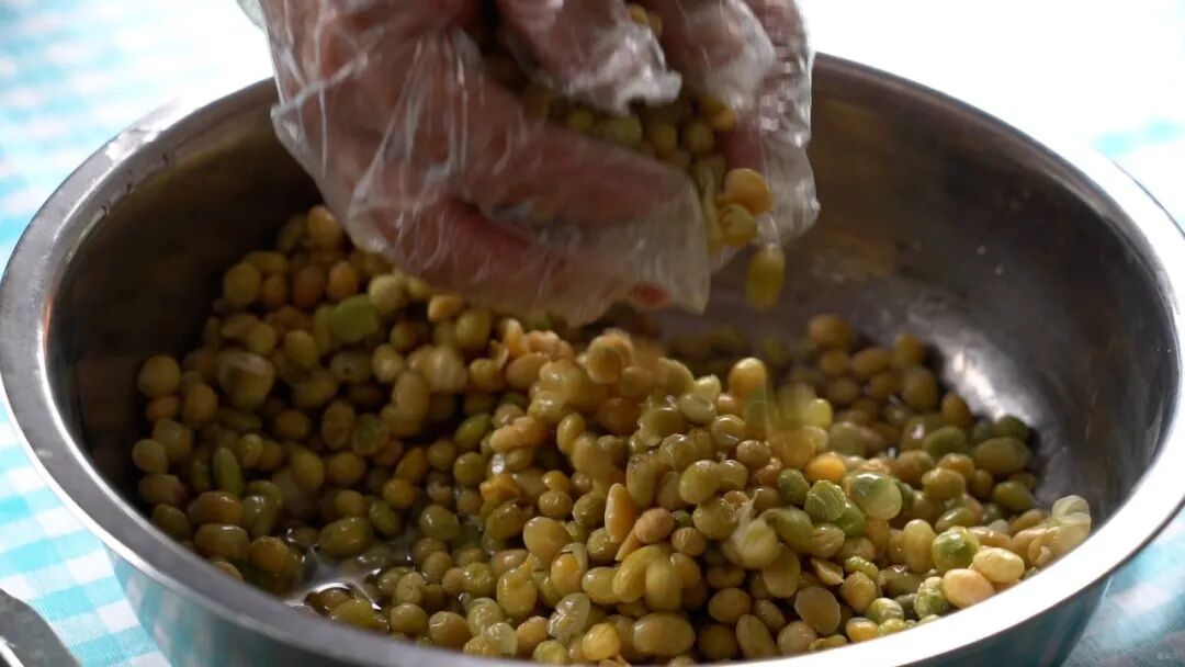 回到家,父女倆便馬不停蹄開(kāi)始將剛采摘下的食材清洗備用。并取來(lái)提前一天泡發(fā)的黃豆,制作荷葉豆腐。