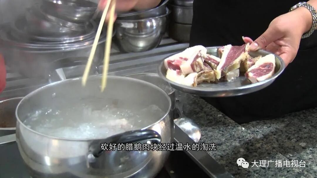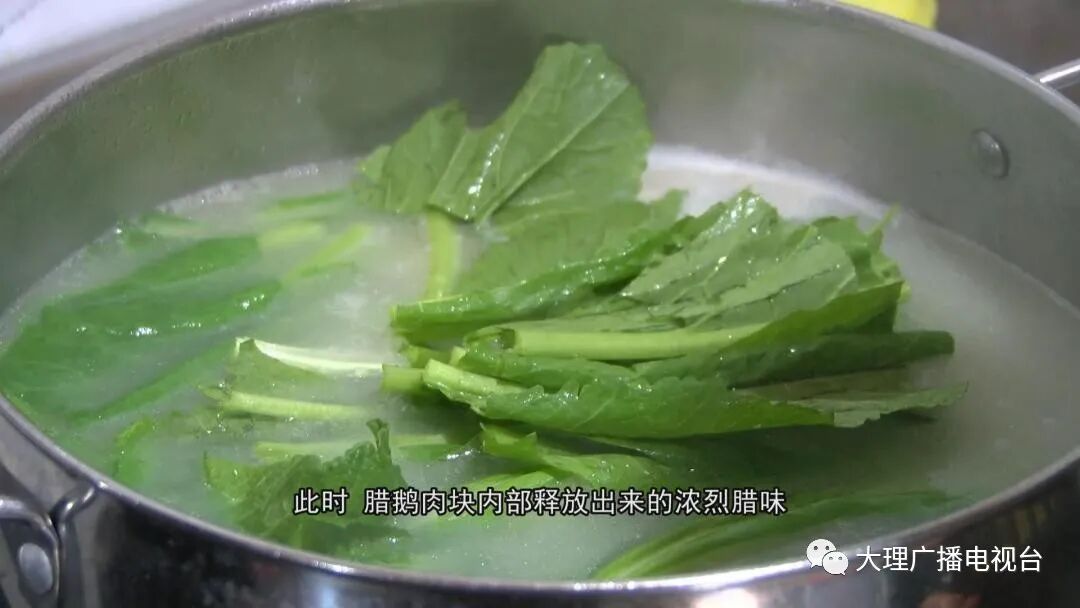 砍好的臘鵝肉塊經(jīng)過溫水的淘洗,腌制時的鹽分已被去掉大半。待水漲開以后,下入臘鵝肉塊,大火燒煮。當鵝肉肉質(zhì)變軟、湯色變白時,是加入青菜的好時機。