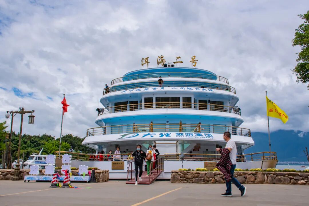 第二個(gè)選擇,從雙廊碼頭乘坐大游船,登上南詔風(fēng)情島游覽,然后游覽洱海,最終??俊敬罄砀邸看a頭。
