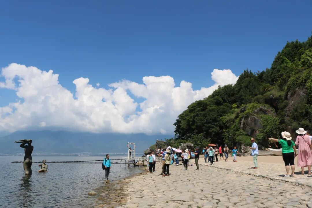 此時(shí),來到島上沙灘旁,澄澈的藍(lán)天中飄著片片白云,漾漾水波,在蒼山的輪廓處,天的那一邊交匯,水、天、山融為一體,動(dòng)靜之間彰顯大理韻味。