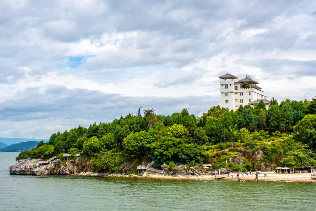 從雙廊遠(yuǎn)眺南詔風(fēng)情島,它如同一葉綠舟,飄蕩在水面,整個(gè)島嶼被超高的綠色植被覆蓋,隱隱約約能看到一點(diǎn)白色建筑。