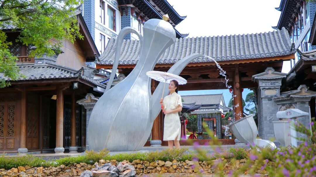 銀如意位于新華銀匠村抱月樓和拱辰樓之間,中間矗立著一個銀字造型的噴泉,銀字噴泉正前方是玉如意造型。鑒于銀如意的美好寓意,銀如意·呼須泉這個景點(diǎn)逐漸成為游客、情侶游覽銀匠村的必打卡點(diǎn),與新華情人橋一道成為鶴慶的最佳愛情表白地。