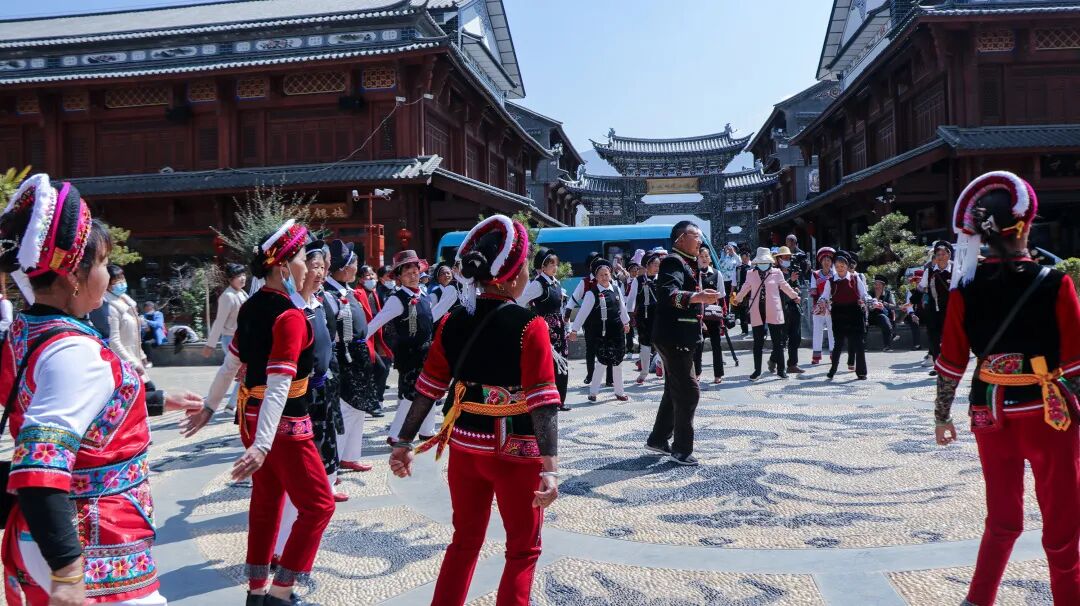 2392平方米的香登廣場位于新華銀匠村抱月、拱辰樓東面,南北兩側(cè)有星廊、月庭,香登白語意為“好閑之地”,是銀匠村內(nèi)一個集民族民間傳統(tǒng)文化交流的匯聚之地,銀匠村每周六舉辦的“篝火之夜”受到了廣場舞愛好者和廣大群眾的歡迎,和新華水磨坊成為周邊群眾和游客娛樂休閑的重要場所。