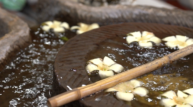 吃花的習(xí)俗在巍山由來已久。棠梨花開時節(jié),趁放牧砍柴把花骨朵采摘回家,浸泡在冷水里,泡上一至二天后,取二兩三線臘豬肉剁碎,和攏糯米面揉勻,捏成厚約15厘米、大如茶盅的圓形餅,待炒鍋中的香油煉熟,將餅放入鍋中,邊用文火煎邊用勺壓勻,兩面翻煎,獨(dú)居彝家風(fēng)味的美食——棠梨花粑粑就做成了。