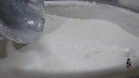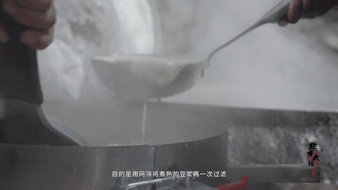 煮漿是通過(guò)加熱讓豆?jié){中的蛋白質(zhì)發(fā)生熱變性的過(guò)程。一方面為后序“沖漿”創(chuàng)造必要條件,另一方面減輕大豆蛋白中的異味,消毒滅菌。邊煮邊撇去表面的泡沫,用柴火熬煮豆?jié){,鍋底形成的鍋巴香能讓豆?jié){風(fēng)味更甚。