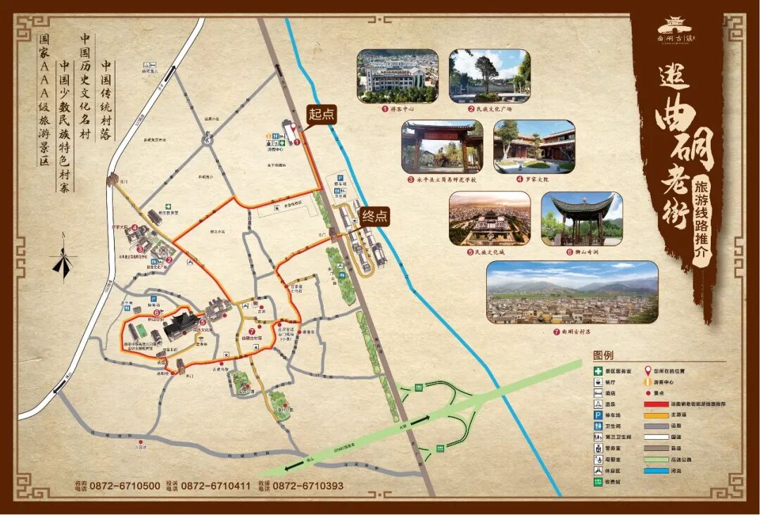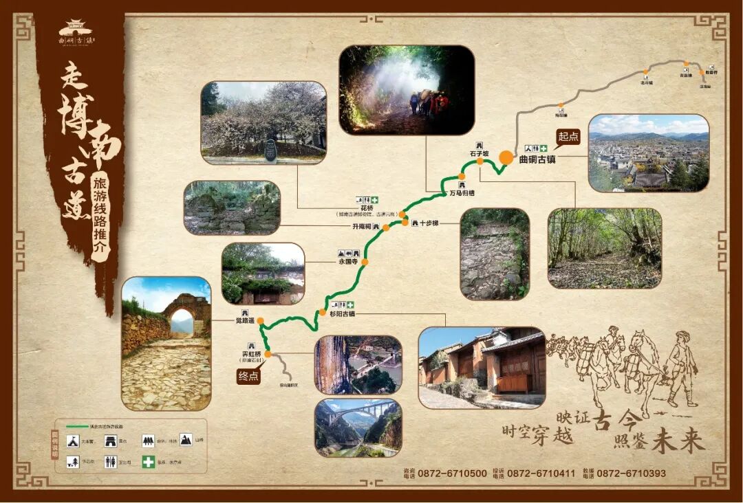 曲硐古鎮(zhèn)—石子坡—萬馬歸槽—花橋古鎮(zhèn)—十步梯—楊升庵祠遺址—永國寺—杉陽古鎮(zhèn)—江頂寺(覺路遙殘關)—霽虹橋(瀾滄江三橋一線景觀、摩崖石刻)