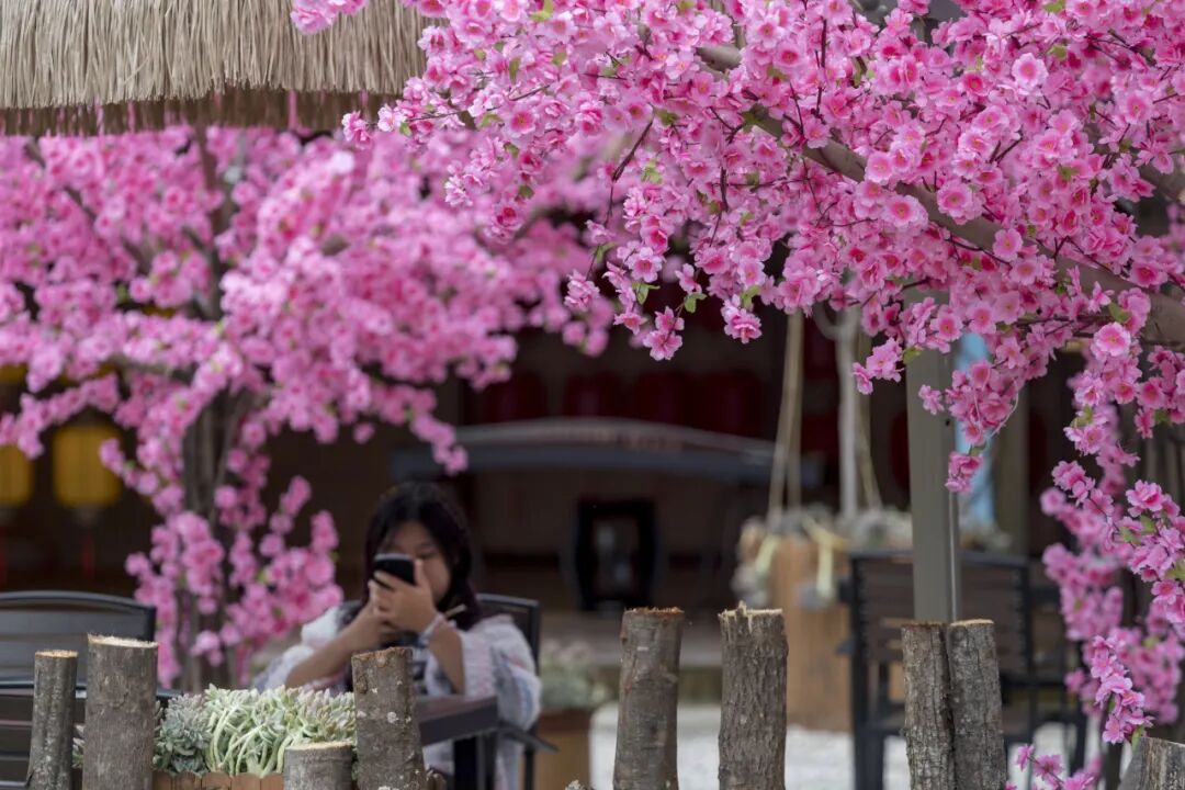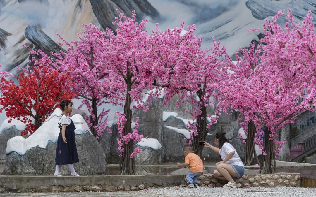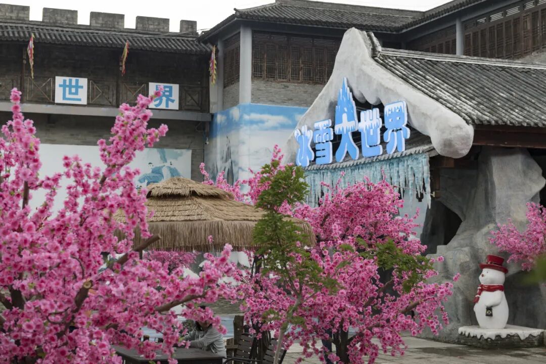 桃花島——位于大理天龍八部影視城內(nèi)冰雪大世界入口處,似如影視劇《射雕英雄傳》中的仙境場(chǎng)景一般,遍地開滿桃花浪漫非常。又如《仙劍奇?zhèn)b傳》中趙靈兒與世隔絕的桃花園般,靜謐且愜意。又似“三生三世,十里桃花”,寫滿江湖愛恨,情仇恩怨。