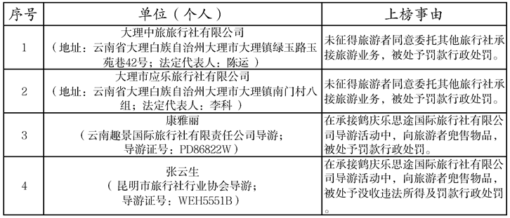 為鞏固好旅游市場秩序整治成果,切實維護旅游者合法權益,引導市場良性健康發(fā)展,10月25日,大理州旅游市場秩序整治工作領導小組辦公室公布了2023年度第9期大理州文化和旅游“紅黑榜”名單,表彰行業(yè)先進,曝光不良企業(yè)和個人,具體名單如下: