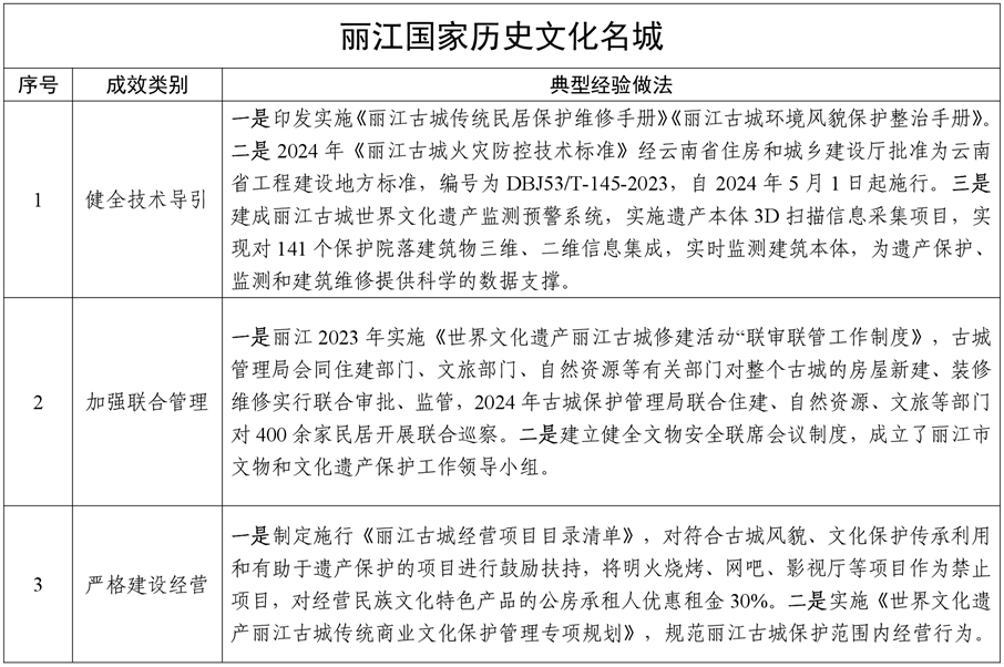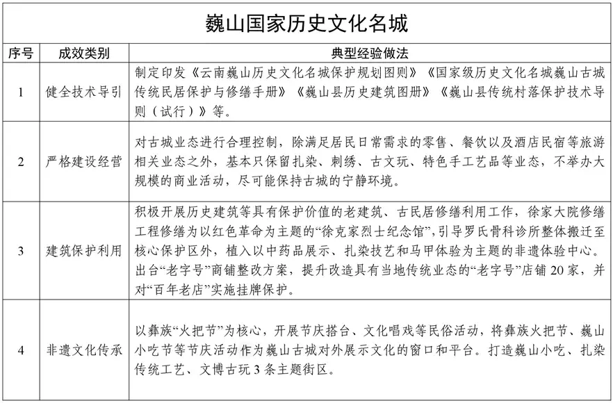 為貫徹落實黨中央、國務院關于歷史文化保護傳承的決策部署,云南省住房和城鄉(xiāng)建設廳依托2024年度國家歷史文化名城專項評估工作,總結了昆明、大理、麗江、建水、巍山、會澤、通海、劍川8座國家歷史文化名城保護利用工作中關于完善頂層設計、加強普查認定、健全監(jiān)督機制、提升人居環(huán)境、開展活化利用等方面的典型經(jīng)驗做法,形成《云南省8座國家歷史文化名城保護利用可復制經(jīng)驗做法清單》。