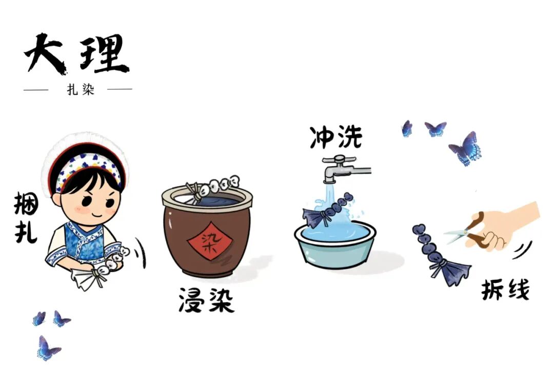 扎染主要步驟:畫刷圖案、絞扎、浸泡